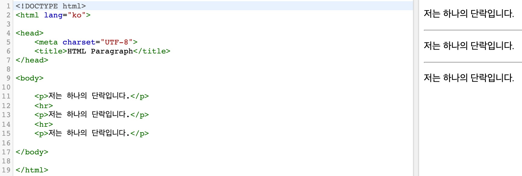 <p>태그 : 본문의 문단, 단락을 작성할 때 사용한다.